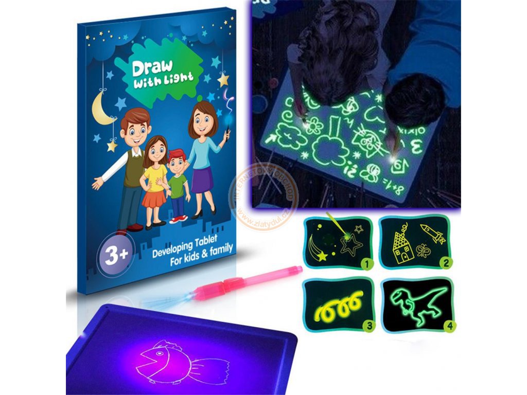 Perem kreslete na fosforeskující tabuli a sledujte tu světelnou nádheru. Jas čar závisí na tom, jakou intenzitou kreslíte. Kreslit děti mohou buď dle přiložené šablony, anebo dle vlastní fantazie. Nakreslené obrázky se nedají smazat, ale po chvíli začnou samy mizet. Po zmáčknutí tlačítka začne pero svítit.