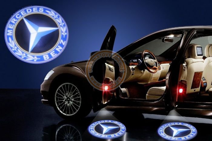 Svítící LED logo projektor Mercedes z malých projektorů, které zobrazí znak automobilky z otevřených dveří
